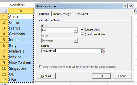 6. Key in the Source as =countries. This must be the name of the range you just created in Step 3. Now click OK to close this dialog box.