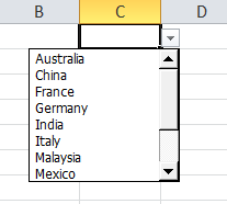 7. Once this is done, you will see a drop down arrow showing up in the cell C1. You will see the list of countries showing up here.